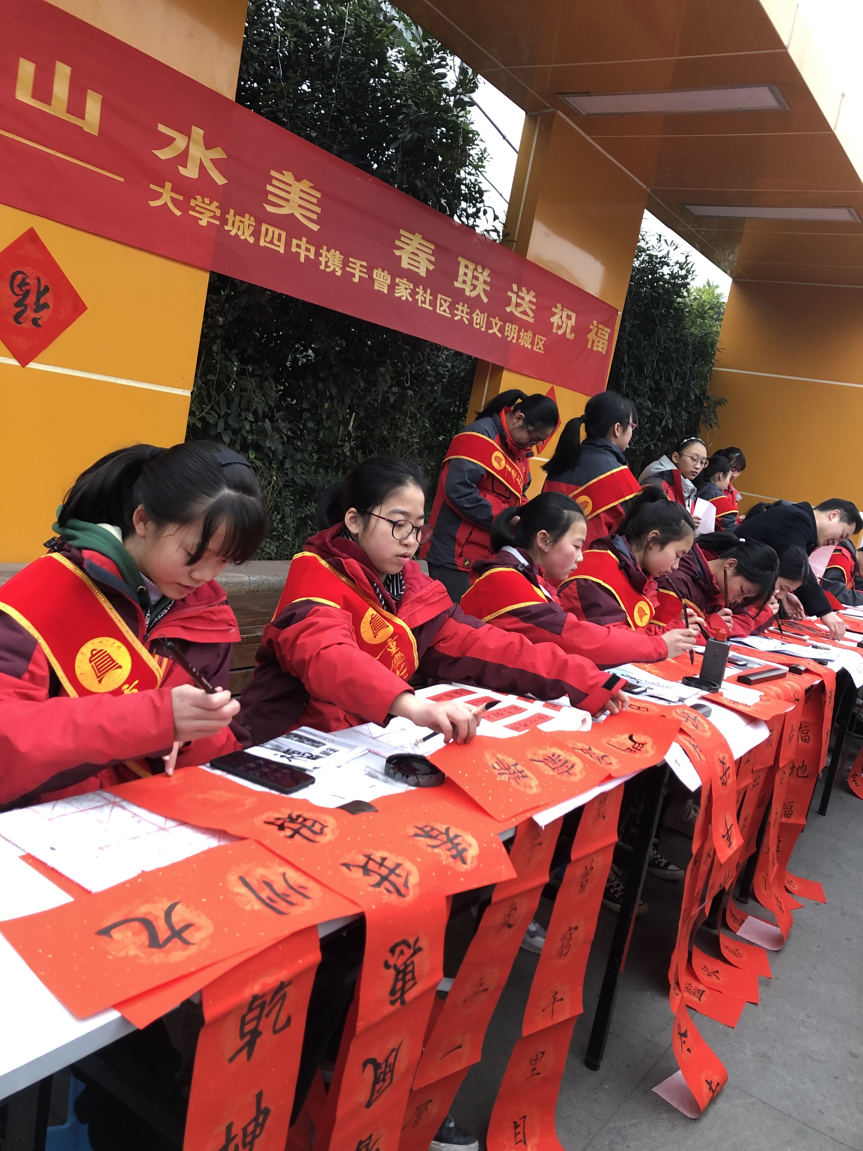 过年的脚步越来越近,虽少了噼噼啪啪的爆竹声,但年的氛围和味道仍然浓厚。因为受曾家镇社区和康居西城社区的盛情邀请,重庆大学城第四中学校的书法志愿者于2019年1月24日上午,来到曾家镇街心花园,下午来到香炉山街道康三社区,为当地百姓写春联,送祝福。杜朱洪副校长带着吴强、阳以明、郑前英、廖藜黎、舒顶兰老师和近20名同学参加了此次活动。