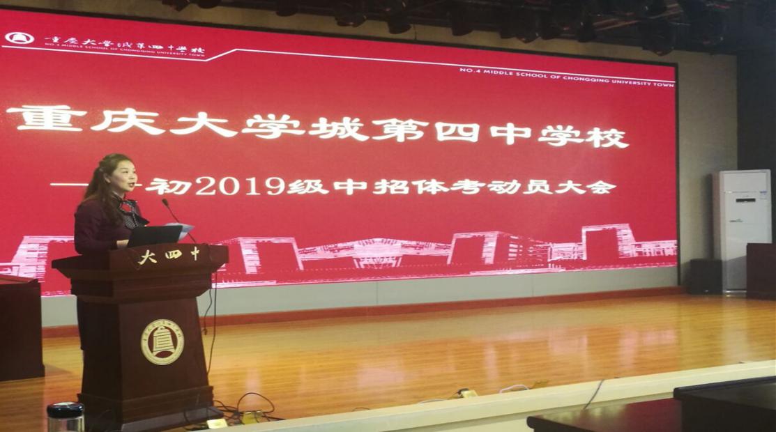 为鼓舞初三年级全体同学以昂扬的斗志迎接中招体考,摘取体训成果,2019年3月29日在我校多功能厅隆重举行大学城第四中学校2019级中招体考动员大会。副校长徐梅、教练翟周洪以及2019级全体师生参加了此次大会。大会由年级组长李荣茂老师主持。
