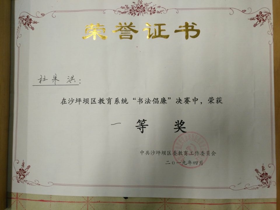 在前期初赛中,大四中的杜朱洪教师,书法功底深厚,脱颖而出,进入决赛。全区参加软笔决赛的共有来自各中小学的教师书法佼佼者44名,杜朱洪教师积极准备,第一个到达比赛场地,第一个完成作品,功夫不负有心人,荣获决赛一等奖。