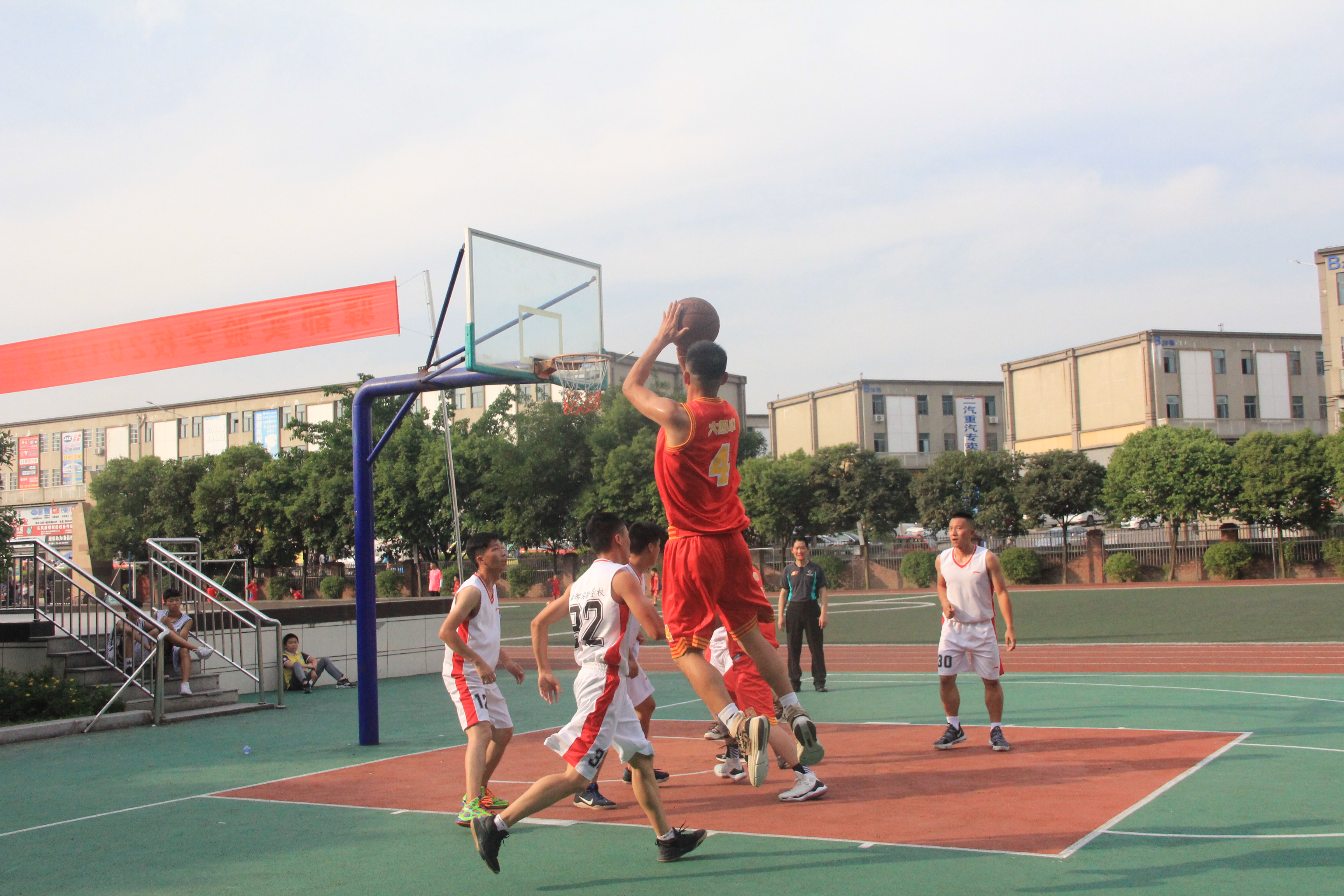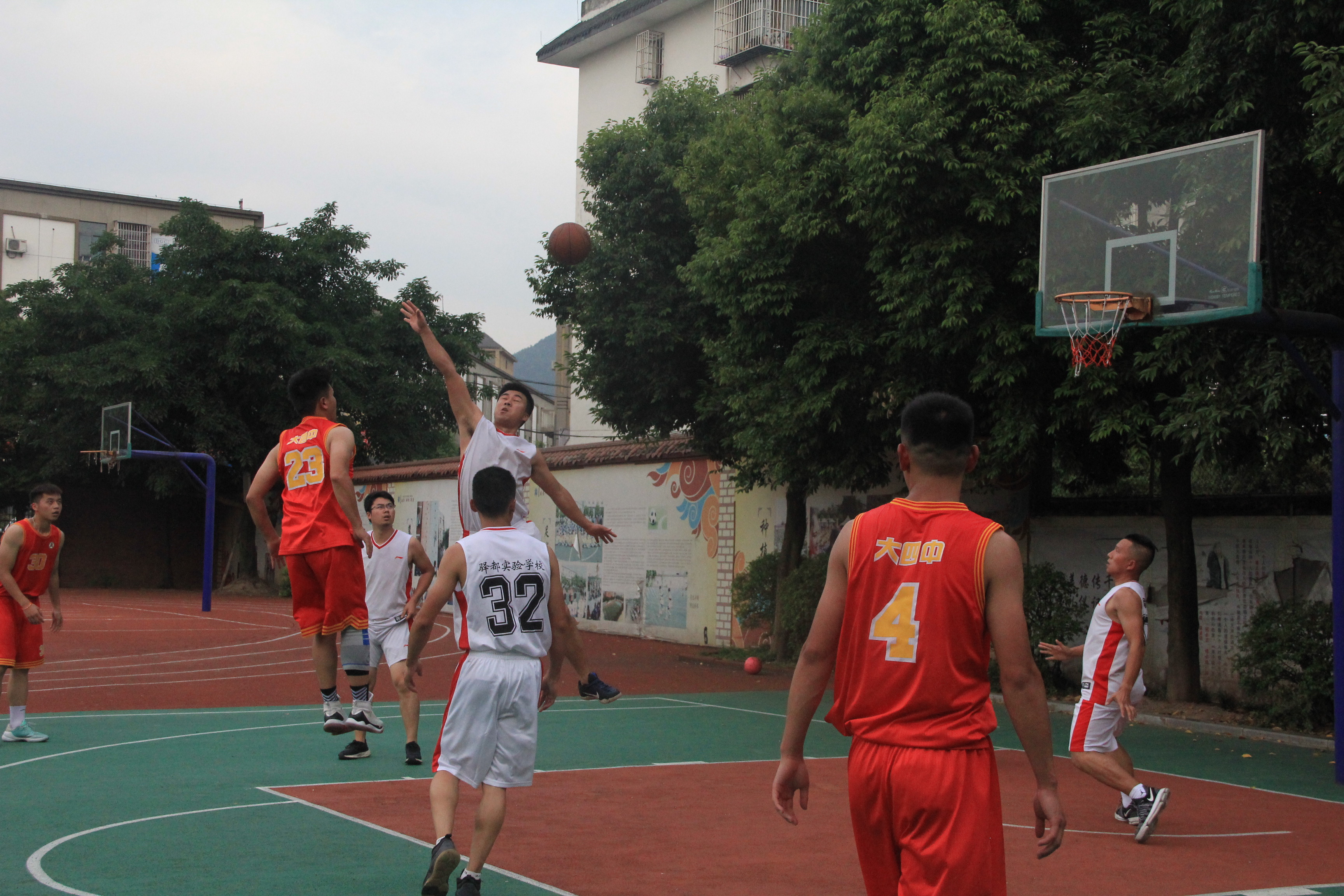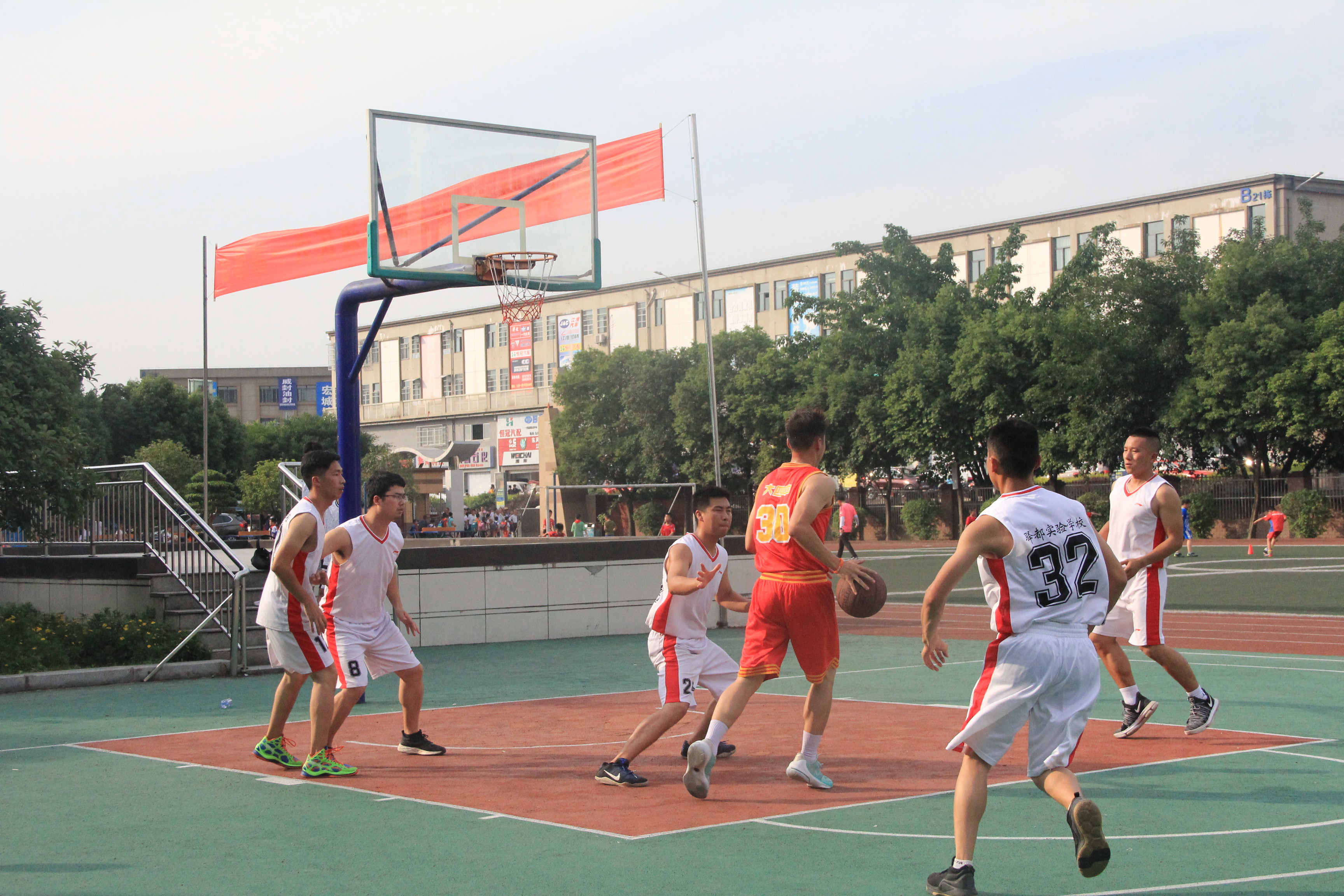 联合教研会后,两校的交流活动又将地点转移到篮球场继续进行。骄阳余热,双方队员的斗志不减反增,简单进行热身后,双方队员微笑握手开赛。