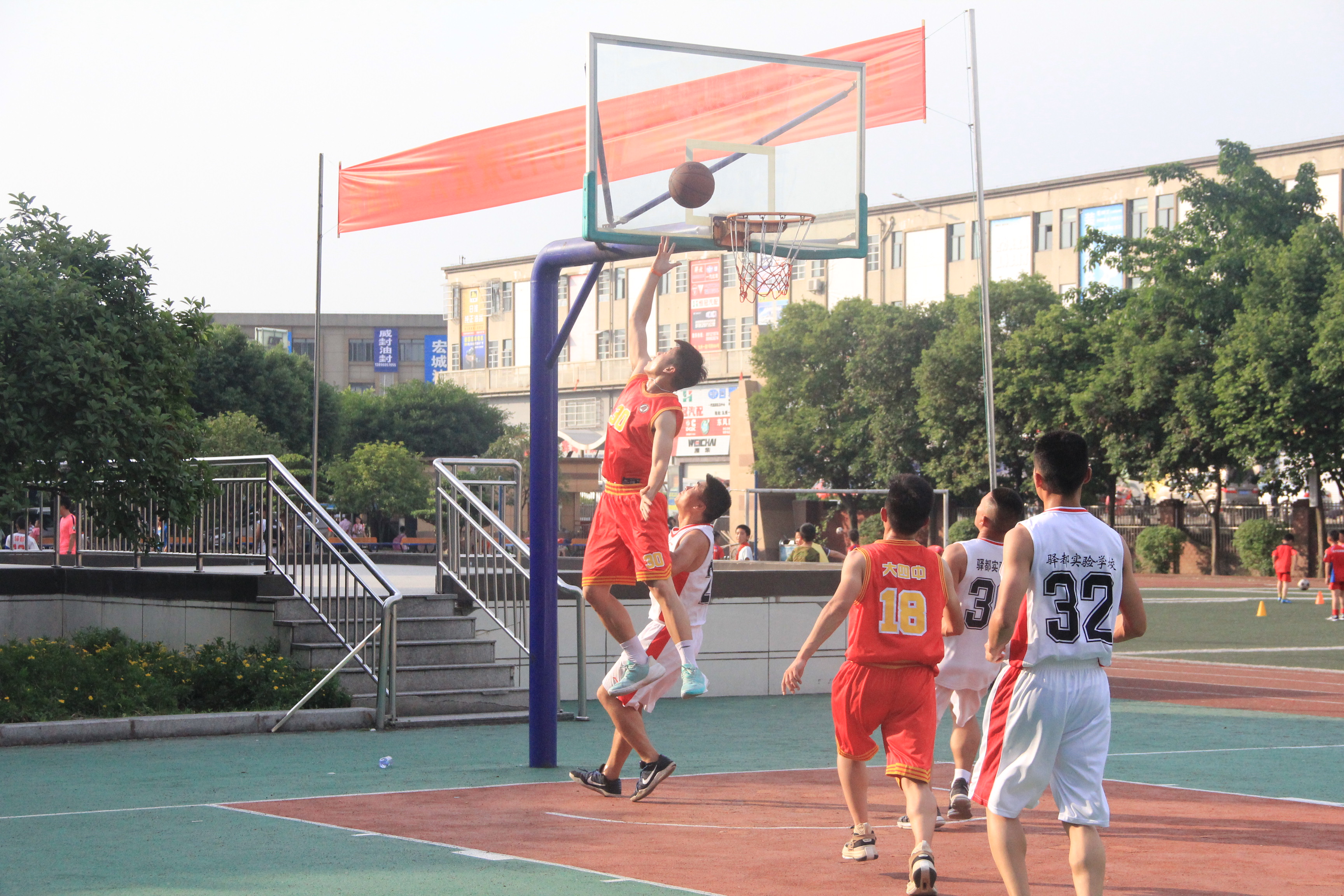 我方与友方球员,在上半场的激烈角逐中,气场全开,互策攻守。驿都实验中学朱校长运筹帷幄,制定战术,开场后,友方防守布控严密,队员间协调冷静灵活,不断依照赛场走势调整步伐,稳扎稳打,篮下切球,一度让我方队员陷入打手犯规的怪圈,而我方虽抢下多个篮板球,却失误连连,动作变形,篮下缠斗多时,仍未取得突破性进展。双方比分你追我赶,僵持不下,最终,上半场以驿都实验学校得分领先结束。