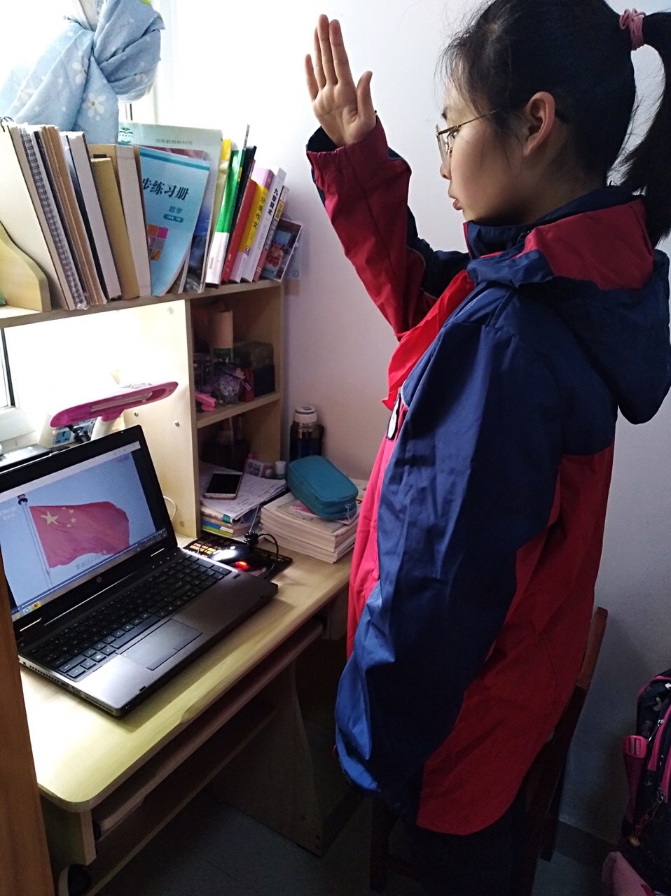 上午八点半,升旗仪式正式开始。全体师生穿戴整齐,肃立在电脑前,在庄严的伴奏声中,齐声合唱《义勇军进行曲》,激昂的旋律唤起中华儿女坚韧不屈的斗志和顽强拼搏的精神。如今面对来势汹汹的新冠肺炎疫情,相信在大家的共同努力下,我们一定能打赢这场攻坚战。