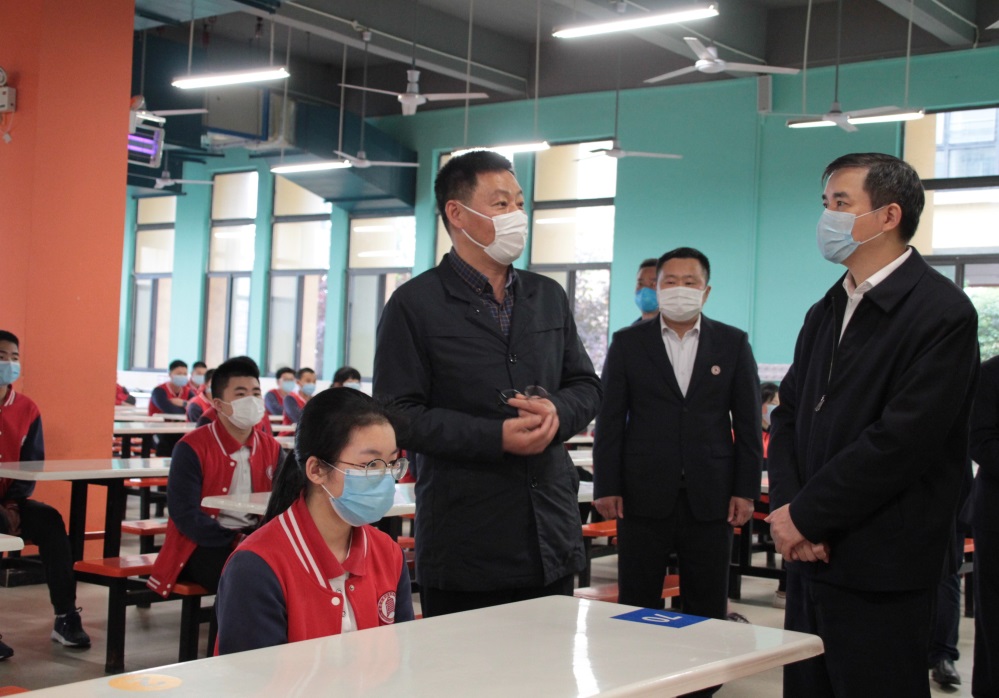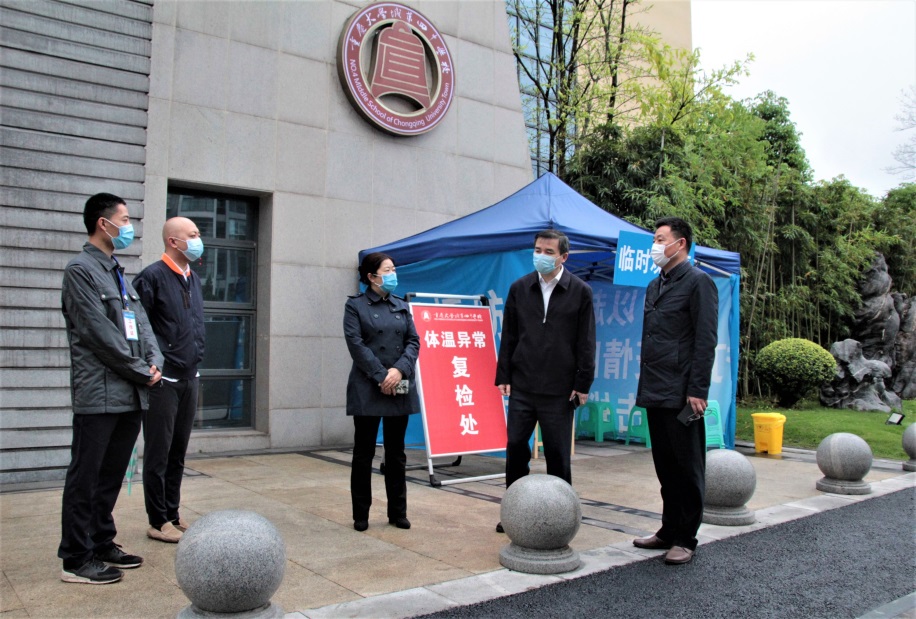 4月20日是重庆大学城第四中学初三复课的第一天,早上7点,400余名初三师生准时到校,按照之前防控演练的场景开始返校复课第一天的生活。上午9点,高新区党工委委员、管委会副主任肖庆华一行人来到大四中督查开学复课相关工作。曾家镇镇长简宗玲与我校校长张长良、副校长徐梅、杜朱洪及各部门负责人陪同检查。同时,曾家镇政府、卫生院、派出所、工商局等相关部门也来到学校陪同督查。