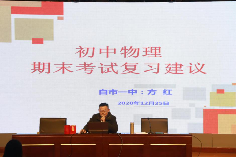 研讨之后,由高新区白市驿一中物理教研组长方红老师作《初中物理期末考试复习建议》专题分享,从期末考试题型、主要考点、难度、难题等方面进行分析,并提出期末考试复习建议。