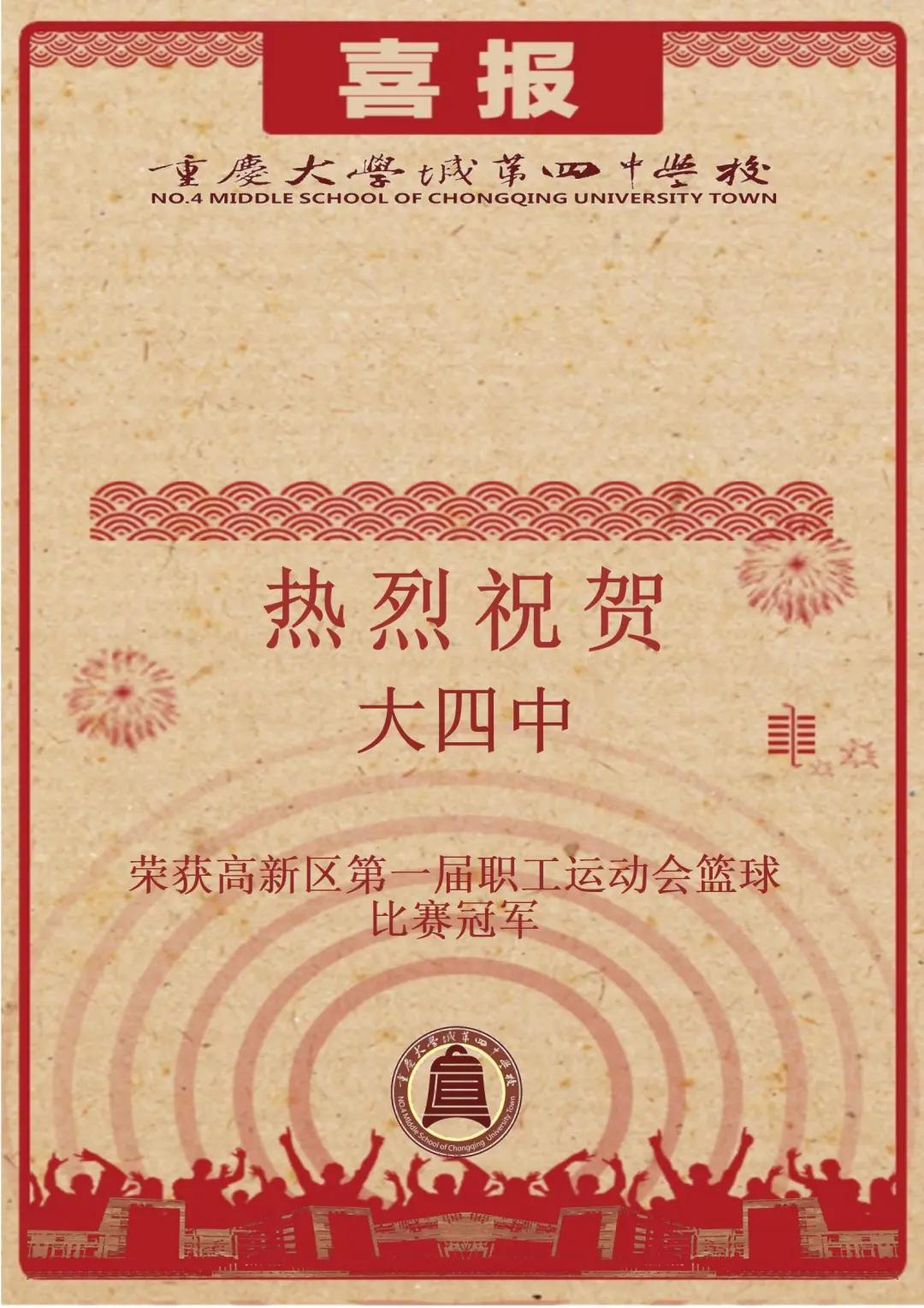 12月5日,重庆高新区第一届职工运动会篮球比赛落下帷幕。本次赛制采取3V3模式,激烈对抗。大学城四中派出张威、高子皓、王瑜骞、杨永帆、杨子龙、杜朱洪六员猛将,经过3天鏖战,历经七场比赛,最终以破竹之势左冲右突,快攻妙传笑到了最后,一举夺魁!